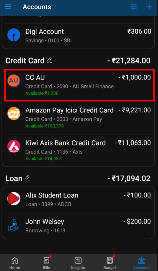 Timelybills ensures that after you create a credit card account, you can use it to track expenses. Each time you make a transaction using the credit card account, the due credit card balance will automatically update and reflect on the credit card account details page.