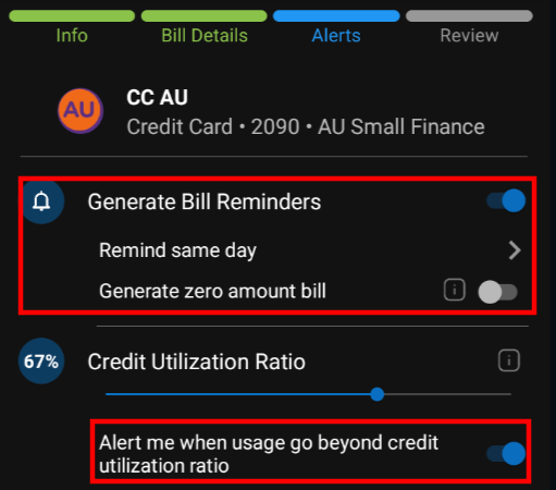 - Set up the alert (It helps in generating upcoming bill and high credit card usage notification)