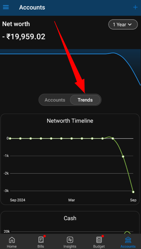 To view the timeline graph tap on the trends toggle below the NetWorth chart |