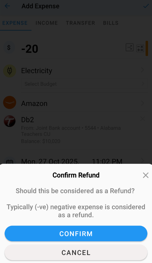 Refund transactions are recorded as an Expense category called “Refund”.